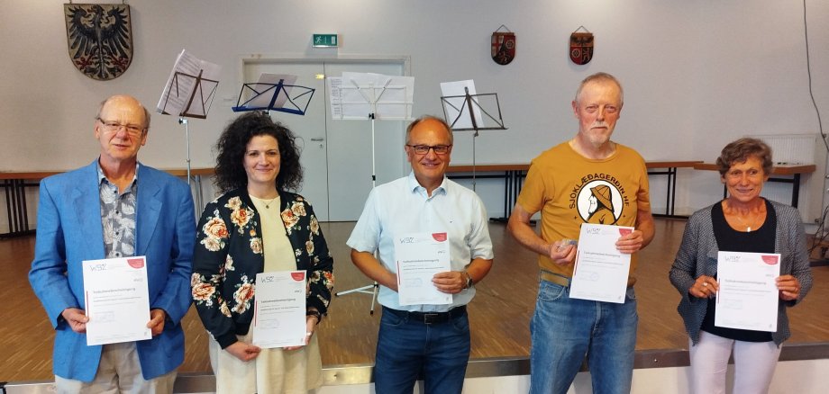 Anfang Juli bekamen die neuen SKM Ihre Zertifikate im Interimsrathaus überreicht. Begrüßt wurden die Anwesenden durch Oberbürgermeister Ralf Claus, der den Ehrenamtlichen seinen Dank für ihr Engagement aussprach. Dr. Dominique Gillebeert, Leiterin der Stabsstelle VuC, betonte die Bedeutung dieses Ehrenamtes und lobte die Bereitschaft, sich für Ingelheimer Stadtgesellschaft einzusetzen. Anschließend überreichten Gillebeert und Yana Tmsah, stellvertretende Leiterin der vhs im WBZ, die Zertifikate an die Absolvent*innen. Der Veranstaltung wurde von einem Klarinettenensemble der Musikschule im WBZ ein würdiger Rahmen verliehen.