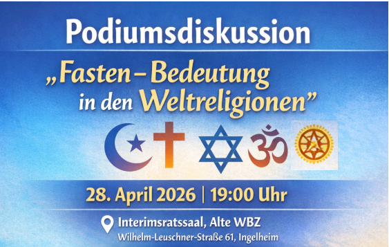 Am Dienstag, 28. April 2026, findet von 19 bis 20.30 Uhr im großen Saal des Interimsrathauses (altes WBZ), Wilhelm-Leuschner-Straße 61, in Ingelheim eine Podiumsdiskussion zum Thema „Fasten und seine Bedeutung in den Weltreligionen“ statt.