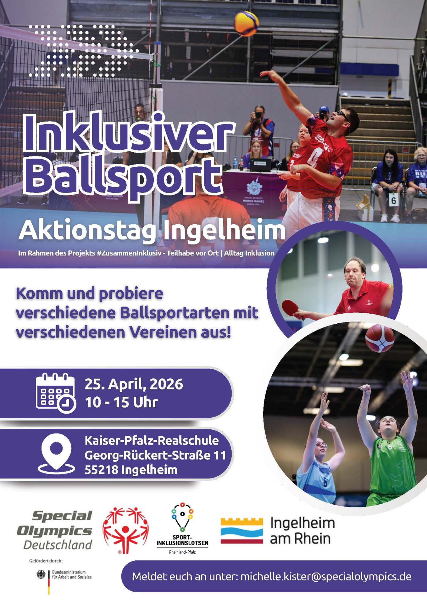Am Samstag, 25. April 2026, findet in Ingelheim ein inklusiver Ballsport-Aktionstag statt. Von 10 bis 15 Uhr sind alle Interessierten herzlich eingeladen, auf dem Gelände der Kaiser-Pfalz-Realschule verschiedene Ballsportarten auszuprobieren und gemeinsam aktiv zu werden.