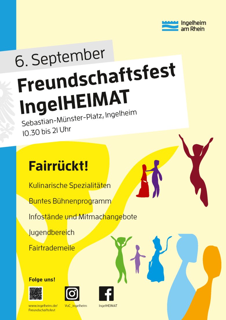 Das Freundschaftsfest heißt INGELHEIMAT: ein wertschätzender, positiver Umgang mit Diversität und Chancengleichheit für alle soll einen Rahmen schaffen, der es allem ermöglicht – unabhängig von Herkunft, Geschlecht, Religionszugehörigkeit oder sexueller Orientierung – sich in Ingelheim zu Hause zu fühlen und zu Hause zu sein.