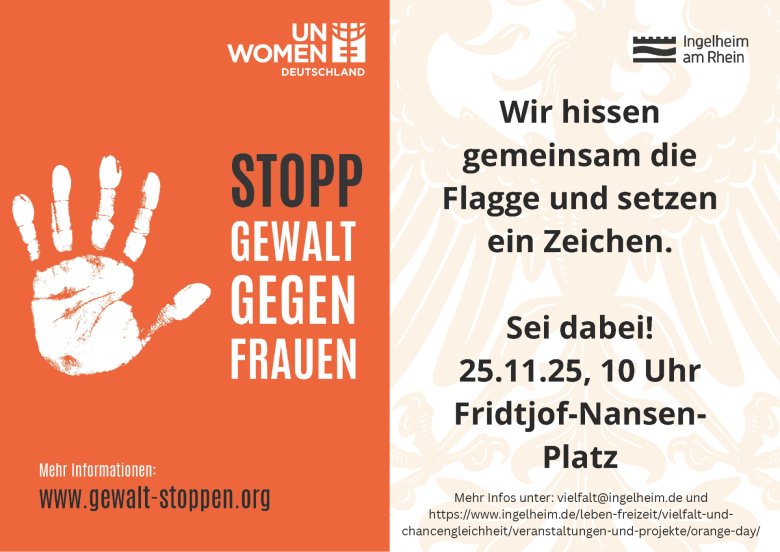 Am 25.11.2025, um 10:00 Uhr wird die Flagge <Nein zu Gewalt gegen Frauen und Mädchen> auf dem Fridjof-Nansen-Platz 1, vor der Konzerthalle KING in Ingelheim gehisst. Zum Hissen der Flagge werden Herr Oberbürgermeister Dr. Ralf Claus, Frau Bürgermeisterin Eveline Breyer, Beigeordnete Frau Dr. Christiane Döll, Stadtratsmitglieder sowie Mitarbeitende der Verwaltung und lokale Institutionen anwesend sein. Des Weiteren wurden diverse Schulen im Stadtgebiet informiert und eingeladen teilzunehmen, sofern es die Unterrichtszeiten zulassen. Auch alle Ingelheimer*innen sind herzlich eingeladen die Aktion mit ihrer Teilnahme zu unterstützen.