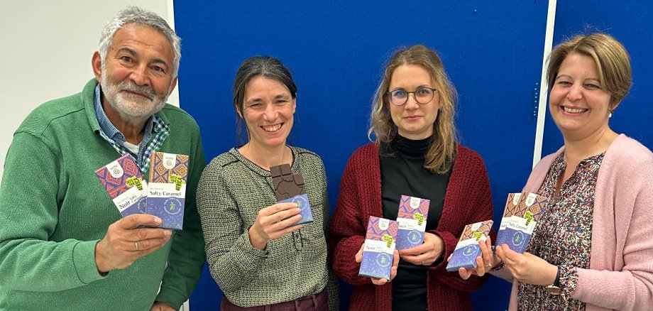 Wichtig war allen Beteiligten, dass die Schokolade nicht nur besonders gut schmeckt und ein besonderes Design hat, sondern auch mit gutem Gewissen genossen werden kann. So fiel die Wahl auf eine Schokolade der „GEPA – The Fair Trade Company“, einem „Urgestein“ des Fairen Handels. Die Importorganisation setzt sich für menschenwürdige Arbeit im globalen Süden ein und verbessert nachhaltig die Lebenssituation der Kleinbäuer*innen vor Ort. Beide Sorten – Salty Caramel mit 41 Prozent Kakaoanteil und Noir Salty Caramel mit 70 Prozent Kakaoanteil – sind fair und mit Bio-Zutaten hergestellt. Der Kakao stammt aus São Tomé, weitere Zutaten kommen aus Togo, Paraguay, Bolivien und Deutschland.