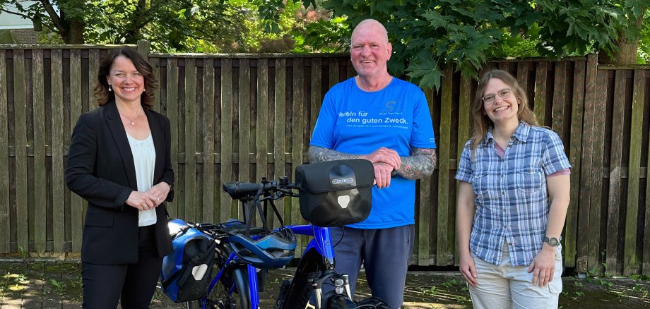 Bürgermeisterin Eveline Breyer und die Beigeordnete Dr. Christiane Döll wünschten Oliver Trelenberg im Namen der Stadt Ingelheim eine erfolgreiche Spendenaktion und allzeit sichere Fahrt. Weitere Informationen zu der Aktion und zum Werdegang Trelenbergs gibt es auf der Internetseite www.oli-radelt.de.