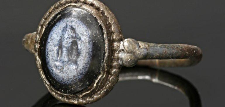 Die Landesausstellung „THE Hidden LÄND“ vereint und präsentiert rund 1500 Fundobjekte überwiegend aus Baden-Württemberg, aber auch angrenzenden Regionen und Ländern. Die Artefakte stammen hauptsächlich aus den Jahrhunderten nach dem Untergang des römischen Reiches, also dem frühen Mittelalter – eine Epoche, die lange als „dunkles Zeitalter“ galt. Ausgrabungen und Entdeckungen der letzten Jahrzehnte zeichnen jedoch inzwischen ein weit weniger düsteres Bild einer Zeit, die von Um- und Aufbrüchen gekennzeichnet war. In dieses Bild passt einer der bedeutendsten Funde vom Reihengräberfeld der Ingelheimer Rotweinstraße: Ein silberner Fingerring mit einem schon damals sehr alten Schmuckstein.