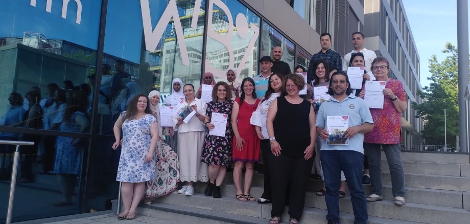 Seit 2018 hat die Stadtverwaltung in Kooperation mit dem Mehrgenerationenhaus West (MGH) und dem Weiterbildungszentrum (WBZ) bereits mehr als 50 ehrenamtliche Gemeindedolmetscher*innen ausgebildet. Diese werden durch die Stabsstelle Vielfalt und Chancengleichheit (VuC) auf Anfrage an Einzelpersonen und soziale Einrichtungen in Ingelheim vermittelt. Das Angebot ist für die Nutzer*innen kostenlos, während die Gemeindedolmetscher*innen eine Aufwandsentschädigung für ihr Engagement erhalten. Dr. Dominique Gillebeert, Leiterin der Stabsstelle VuC, bedankte sich während der Zertifikatsübergabe bei den Anwesenden für ihre Bereitschaft, andere zu unterstützen und sich für die Gemeinschaft einzusetzen: „Wir freuen uns sehr, dass wir nun 18 weitere Personen in unseren Dolmetscherpool aufnehmen und so noch mehr Menschen in Ingelheim unterstützen können. Wir haben nun 74 engagierte Gemeindedolmetscher*innen, denen wir Einsätze vermitteln können.“ Yana Tmsah, stellvertretende Leitung der vhs im WBZ, freut sich besonders darüber, dass viele ehemalige Sprachkursteilnehmer*innen nun zu den Absolvent*innen gehören. Dies sei ein wunderbares Beispiel für erfolgreiche Integration, betonen Tmsah, Tamouro und Gillebeert.