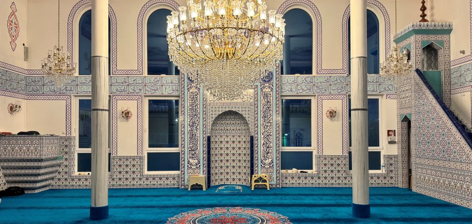 Begrüßt wurden die Teilnehmenden von Sevim Sarikaya, Mitglied des Vorstands der Moscheegemeinde. Sarikaya führte die Besuchergruppe durch das im Jahr 2008 fertiggestellte Moscheegebäude und stellte gemeinsam mit Gemeindemitgliedern die einzelnen Bereiche vor. Besonders eindrucksvoll für die Gäste war der Besuch des Gebetsraums: Beeindruckende Ornamente und Kaligraphien zieren hier die Wände, imposante Kronleuchter hängen von der Decke. Die Moschee wurde dank privater Spenden und mit ehrenamtlichem Einsatz errichtet.