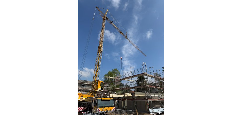 Beim Vor-Ort-Termin konnten Interessierte miterleben, wie vormontierte Wände des zweiten Gebäudes mithilfe eines Krans aufgestellt wurden. Insgesamt entstehen am Standort vier Hoffnungshäuser mit 26 Mietwohnungen, überwiegend gefördert und damit für Haushalte mit Wohnberechtigungsschein zugänglich. Ziel des Projekts ist es, bezahlbaren Wohnraum zu schaffen und gleichzeitig ein aktives, integratives Miteinander von Menschen mit und ohne Fluchterfahrung zu ermöglichen.