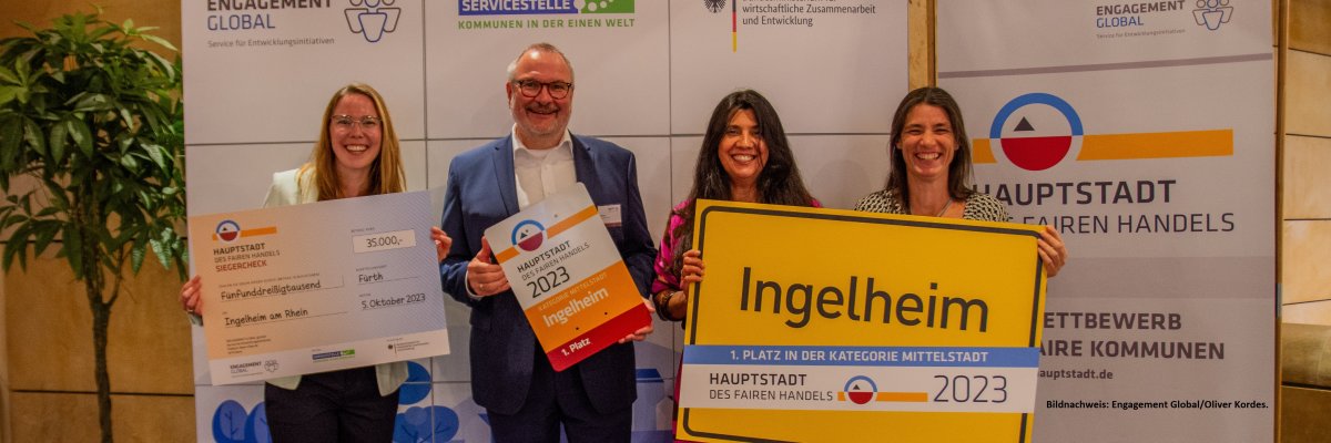 Neben München und Sankt Peter-Ording darf sich Ingelheim „Hauptstadt des Fairen Handels“ nennen. Die Kommunen wurden im Beisein der Parlamentarischen Staatssekretärin im Entwicklungsministerium, Dr. Bärbel Kofler, im Rahmen einer feierlichen Preisverleihung am 5. Oktober 2023 in Fürth ausgezeichnet. Seit 20 Jahren wird der Preis durch die Servicestelle Kommunen in der Einen Welt (SKEW) von Engagement Global im Auftrag des Bundesministeriums für wirtschaftliche Zusammenarbeit und Entwicklung (BMZ) an Städte und Gemeinden verliehen. Alle zwei Jahre wird damit herausgehobenes lokales Engagement von Kommunen im Themenfeld Fairer Handel und Faire Beschaffung ausgezeichnet.