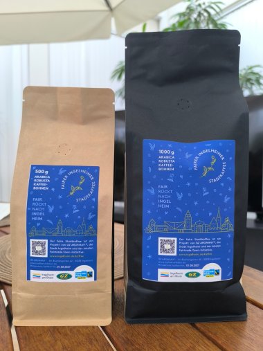 Der faire Stadtkaffee ist das zweite Faire Ingelheimer Stadtprodukt der lokalen Fairtrade-Town-Initiative, dessen Gestaltung, Bewerbung und Vertrieb in Kooperation mit GZ Aromany ® und der Stadt Ingelheim entstand. Der Kaffee ist Fairtrade- und Bio-zertifiziert gemäß den Standards von Fairtrade International bzw. der EU-Öko-Verordnung. Das bedeutet, dass die Kaffeepflanzen frei von Pestiziden oder anderen chemischen Düngern nachhaltig angebaut und unter fairen Bedingungen in Handarbeit von Kleinbäuer*innen gepflückt werden. Der Kaffee setzt sich aus 50 % Arabica- und 50 % Robusta-Bohnen zusammen und stammt überwiegend aus Honduras und Tansania. Er wird von GZ AROMANY® verarbeitet und vertrieben. Geröstet werden die Kaffeebohnen langsam und aromaschonend im Solar-Trommelröster. Die Verpackung ist frei von Aluminium, besteht aus nachwachsenden Rohstoffen und ist kompostier- und recycelbar. Der Kaffee schmeckt pur, aber auch als Espresso, Cappuccino oder Latte Macchiato.