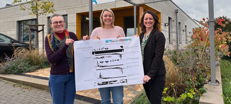 Bild (v.l.n.r.): Sylvia Hansmann, Laura Pott und Eveline Breyer vor dem Eingangsbereich der Kita „Wildlinge“, Bild: Stadt Ingelheim.